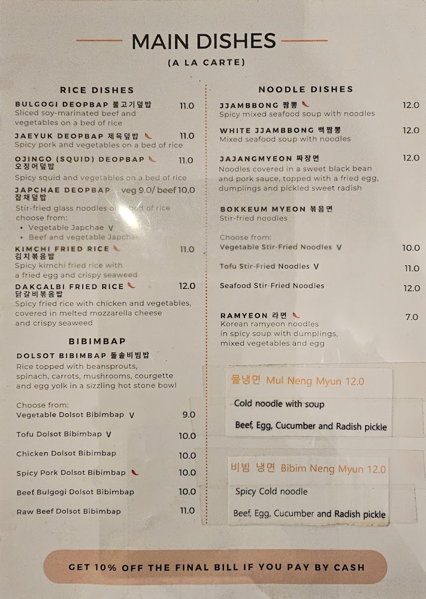 Korean glass noodles served with either marinated beef and vegetables or mixed vegetables with sesame oil(:)